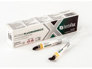 El ÁCIDO FLUORHÍDRICO 20% de la marca DentaFlux es la solución ideal para el acondicionamiento de superficies cerámicas. Su fórmula avanzada garantiza la obtención de una unión química y mecánica superior y una aplicación precisa y controlada, convirtiéndolo en un aliado indispensable en su práctica diaria.