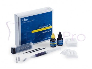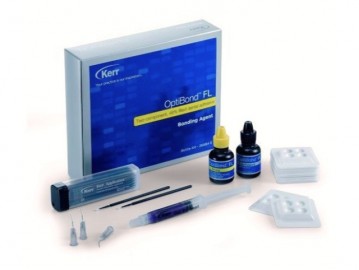 El Kit Optibond FL de Kerr Hawe es un adhesivo dental de dos componentes Optibond de Kerr, además de poseer características de ser un material elástico para Sellados y Obturaciones. Al igual que las resinas compuestas la infiltración del material en las micro-retenciones producidas por la acción de un acondicionador en la superficie del esmalte y la dentina, con la particularidad de que, la dentina no debemos resecarla, pues las bandas de colágeno que forman parte de dicho tejido y conforman la pared de los canalículos dentinales, se colapsan y los bloquean. Esto es de vital importancia, pues como la dentina posee un 25% de agua dentro de sus componentes y el adhesivo al ser hidrófilo, la conservación del tenor normal de humedad en el tejido facilita su infiltración a planos más profundos de la capa superficial de la dentina