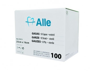 | Características: Uso quirúrgico. 15 hilos. 16 x 25 cm. 8 capas. -Plegado 7,5 x 6,5 cm. -20 sobres. -(* Sobres individuales de 5 unidades ). | Contenido: Caja con 20 sobres de 5 unidades. Referencia(s) del Fabricante: 270711 |