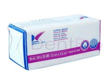 | Características: -Malla de 19 x 15cm -Plegadas en 8 capas de forma cuadrada -Gran consistencia -Alta capacidad de absorción -Medidas de la gasa 7,5 x 7,5 cm | Contenido: -200 Gasas Referencia(s) del Fabricante: -AC04302 MEDICALINE M |