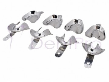 | Características: -Descripción: Cubetas no perforadas para desdentados totales. -Fabricadas en acero inoxidable con rebordes para retención del material de impresión. -Esterilizable en autoclave hasta 140°C. -Tamaños: S, M, L, XL superior e inferior. | Contenido: -Pack x8 unidades: 4 modelos superiores y 4 modelos inferiores. Referencia(s) del Fabricante: 840000 |