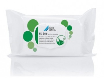 Toallitas desinfectantes Sensitive FD 366 de Durr Dental, especialmente formuladas para la desinfección de superficies sensibles a base de alcohol.
