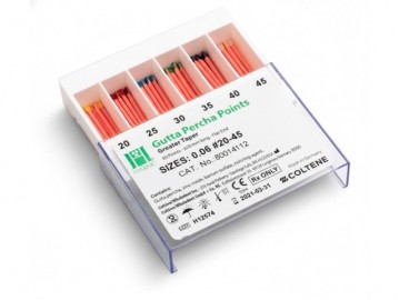 | Características: Indicaciones Clínicas Ideal para la obturación de conductos radiculares conformados con instrumentos rotatorios de Níquel-Titanio (NiTi) que tienen una conicidad constante o variable de .04. Ventajas del GUTTAPERCHA CONICIDAD .04 para el Profesional