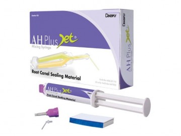 El AH Plus Jet de Dentsply DeTrey es una resina radiopaca de gran resistencia para la obturación de los conductos radiculares en endodoncia a base de epoxiamina totalmente compatible. AH Plus Jet Starter Kit de Dentsply viene presentado en jeringa automezcla facilitando el manejo del cemento y alarga la conservación del producto evitando que se seque. La jeringa mezcla automáticamente los componentes de sellador en la proporción ideal. Reduciendo el tiempo de trabajo. Resina consistente con facilidad de mezclado y eliminación. Posibilidad de aplicación intraoral directa utilizando las puntas mezcladoras. Lo que ofrece más precisión y menos tiempo de trabajo, sin desperdicio de material