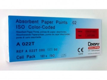 | Características: -Diseñadas para secar el conducto radicular -Las puntas de papel estériles son utilizadas para secar el conducto antes de la obturación, colocar medicamentos intraconducto y ayudan a determinar el color y la calidad del exudado | Contenido: -180 Unidades Referencia(s) del Fabricante: -A022T00002500 MA |
