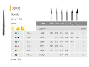 | Características: Fresa de diamante fg para turbina. -Velocidad recomendada entre 75000 y 100000 rpm. -Forma de lanza de cono apuntado. -Disponible en diferentes tamaños y granos. | Contenido: 5 Unidades. Referencia(s) del Fabricante: FG859010, 806 314 166 524 016, 806 314 166 504 014, 806 314 166 504 016, 806 314 166 494 016, 806 314 166 514 016 |