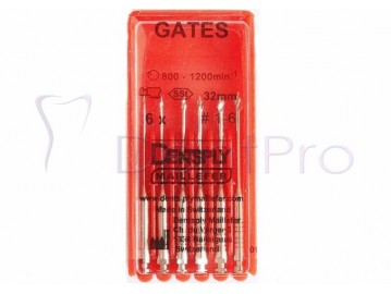 Las Fresas Gates de Dentsply Maillefer están especialmente diseñadas para ampliar la parte superior del canal, eliminando el grueso de la estructura dental y conformando el conducto radicular, normalmente se emplean para preparar el tercio coronario y eliminar posibles interferencias. Es mejor llevarlas al conducto depués de haberlo ampliado hasta al menos una lima del 25.