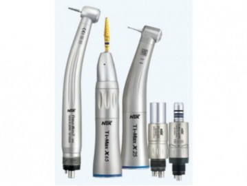 Incluye la turbina Pana-Max2 M4, el contra-ángulo Ti-Max X25, el micromotor neumático S-Max M205 y la pieza de mano recta Ti-Max X65, conformando un equipo rotatorio completo para prácticas preclínicas y clínicas.