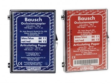 | Características: Tienen una propiedad de marcación bastante precisa gracias a su bajo grosor. -Este papel no presenta ningún problema con superficies oclusales difíciles e impregnadas de saliva como por ejemplo el oro, la cerámica, las superficies metálicas pulidas o los acrílicos. -Incluso con presión masticatoria leve se revientan las cápsulas y liberan claramente el color. | Contenido: Paquete 100 hojas. Referencia(s) del Fabricante: BK 11, BK 12 |