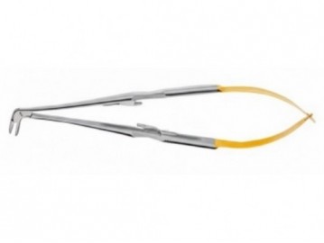 Este porta-agujas de 17 cm, fabricado con la tecnología Liquid Steel y con insertos de carburo de tungsteno (TC), ofrece una resistencia excepcional a la corrosión y un agarre inigualable. Su ángulo de 80 grados es ideal para acceder a zonas de difícil visibilidad, permitiendo al cirujano realizar suturas precisas con agujas finas en procedimientos microquirúrgicos.