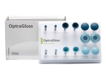 OptraGloss consta de un pulidor diamantado azul oscuro para el prepulido y un pulidor diamantado azul claro para el pulido de alto brillo. Para el pulido en un solo paso de obturaciones de composite, solo se utiliza el pulidor de alto brillo. Los pulidores se presentan en las formas "Copa", "Llama", "Lente" y ahora también "Rueda espiral" (solo como pulidor de alto brillo).