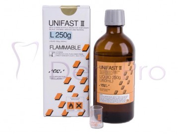 El Unifast III Líquido de GC es una resina acrílica de provisionales autopolimerizable para inlays, coronas, puentes y reparaciones. Unifast III introduce la tecnología SURF (Surface Uniformity Revolutionary Fixation Technology), un polimero nuevo y revolucionario. La nueva tecnología permitió a GC, desarrollar una composición perfectamente equilibrada que tiene una excepcional adaptabilidad resistencia a la abrasión, dureza y resistencia a la flexión sin la necesidad de incluir materiales de relleno