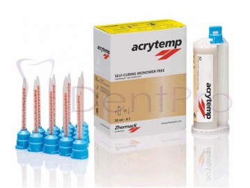 La Acrytemp de Zhermack es un resina bis-acrílica autopolimerizable para la preparación de coronas y puentes provisionales.Sistema de automezcla en cartucho 4:1.Formulación a base de ésteres metacrílicos multifuncionales exenta de monómeros