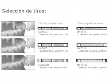 | Características: Utilice los anillos de identificación de LM para marcar las cintas preinstaladas correspondientes a las superficies mesial (naranja) o distal (azul). -Disponibles con abertura: La parte lisa de la cinta se utiliza cuando el contacto es excepcionalmente estrecho, y sin perforaciones. | Contenido: 50 Unidades. Referencia(s) del Fabricante: 5502, 5503, 5512, 5513 |